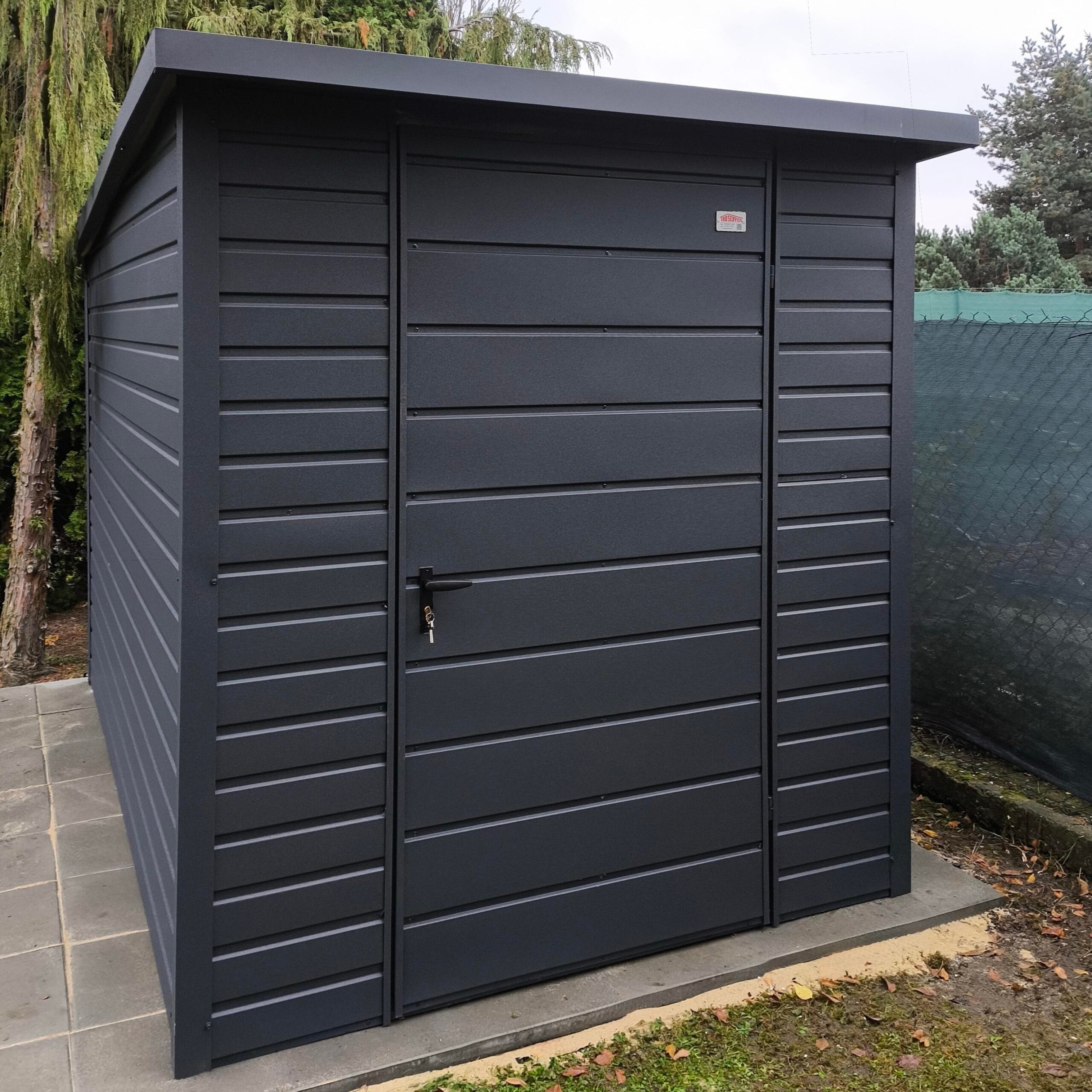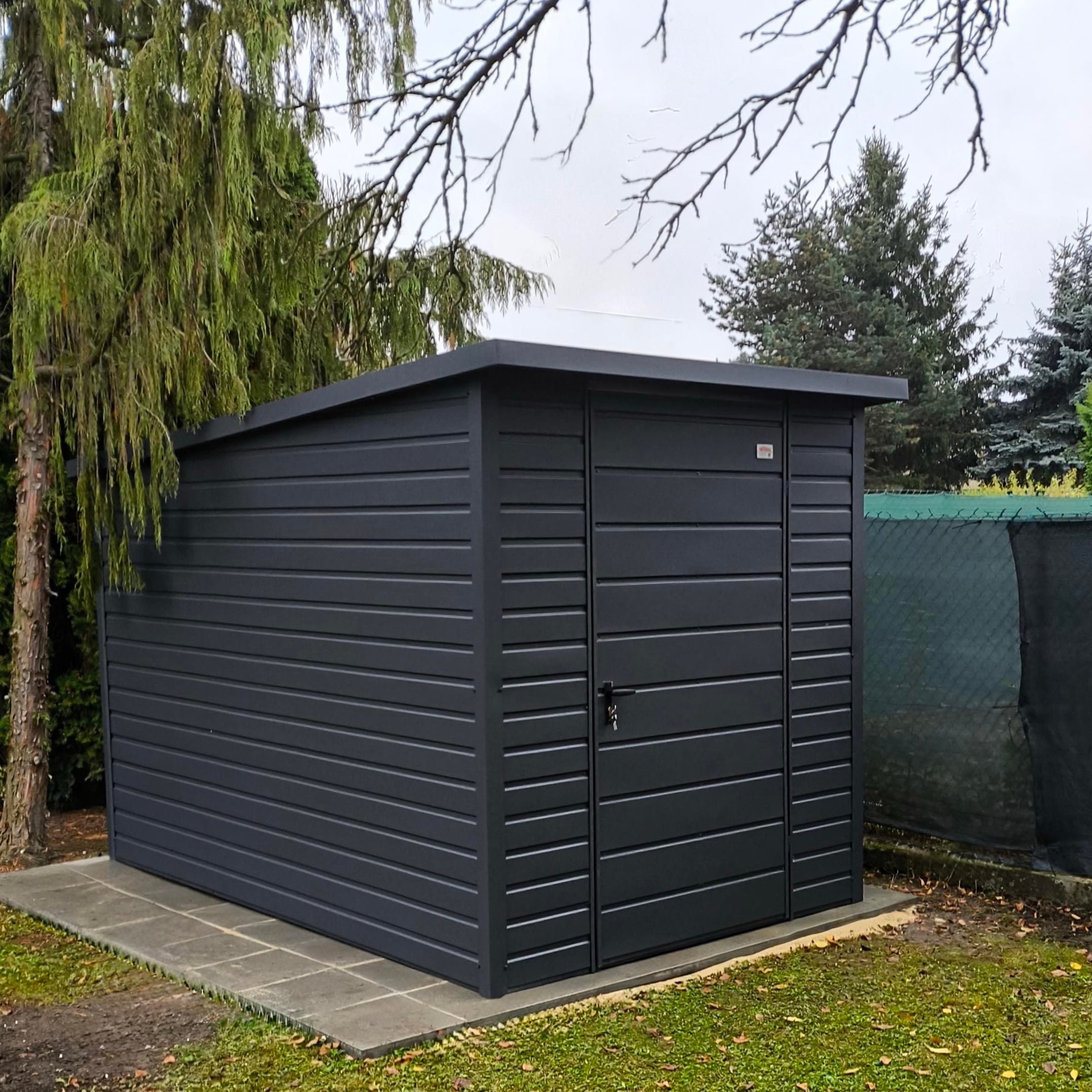 Domek ogrodowy 2×3 m wykonany z trwałej, ocynkowanej blachy trapezowej w kolorze grafitowym to praktyczne i estetyczne rozwiązanie do każdego ogrodu. Jednospadowy dach odprowadzający wodę i śnieg zapewnia ochronę przed warunkami atmosferycznymi o każdej porze roku.