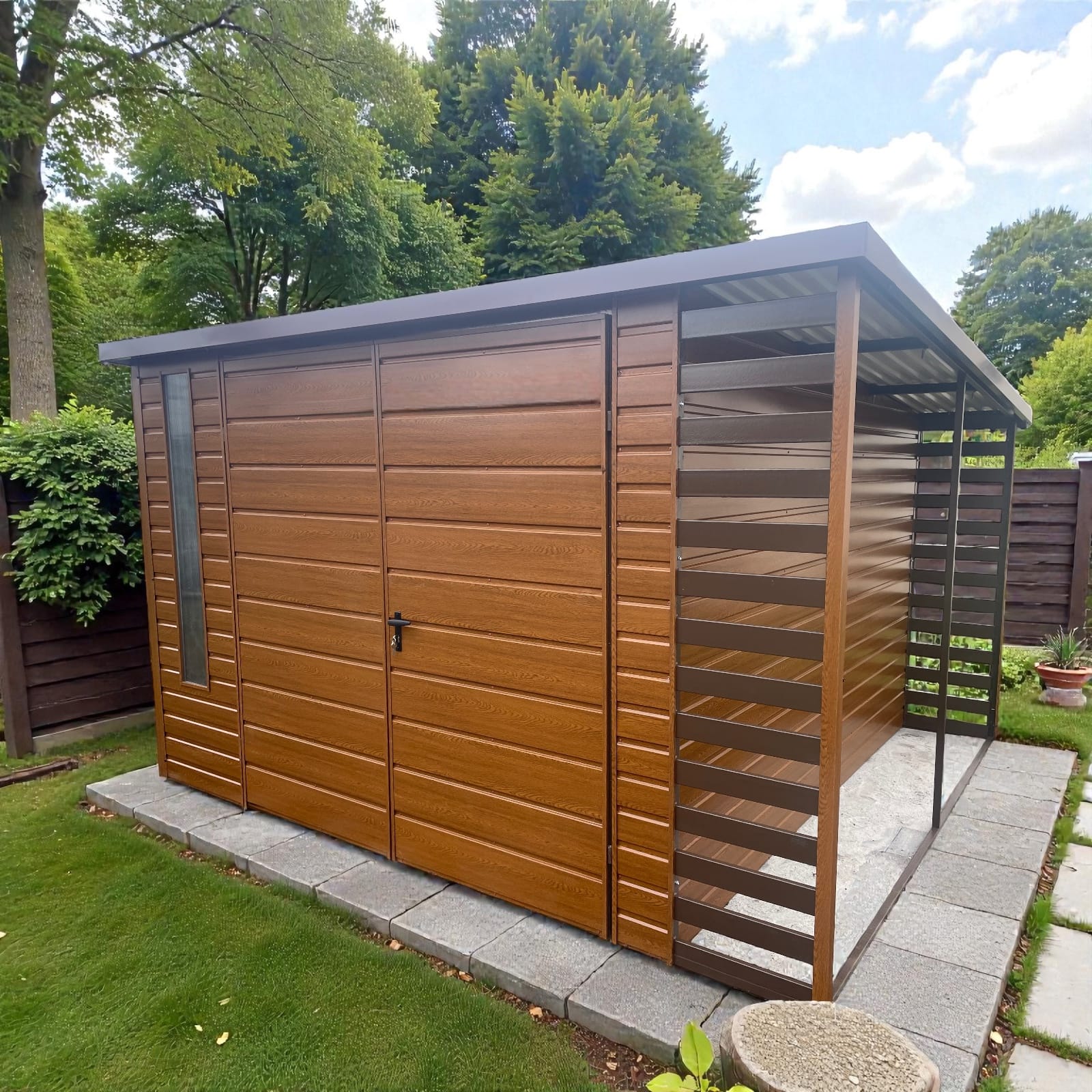 Domek ogrodowy 3,5×3 m wykonany z trwałej, ocynkowanej blachy trapezowej w kolorze złoty dąb ciemny to praktyczne i estetyczne rozwiązanie do każdego ogrodu. Jednospadowy dach odprowadzający wodę i śnieg zapewnia ochronę przed warunkami atmosferycznymi o każdej porze roku.