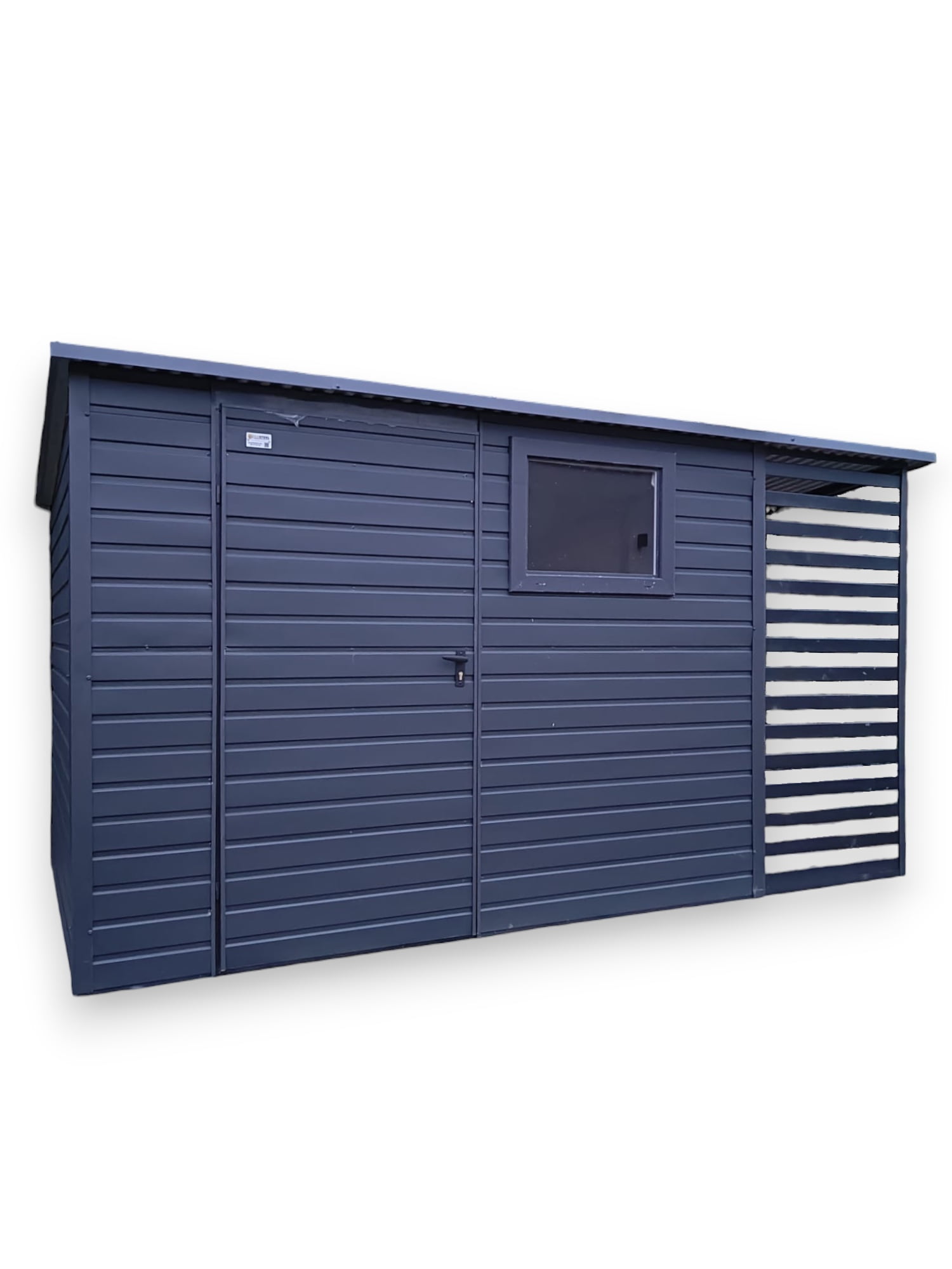 Domek ogrodowy 4×3 m wykonany z trwałej, ocynkowanej blachy trapezowej w kolorze grafit to praktyczne i estetyczne rozwiązanie do każdego ogrodu. Jednospadowy dach odprowadzający wodę i śnieg zapewnia ochronę przed warunkami atmosferycznymi o każdej porze roku.