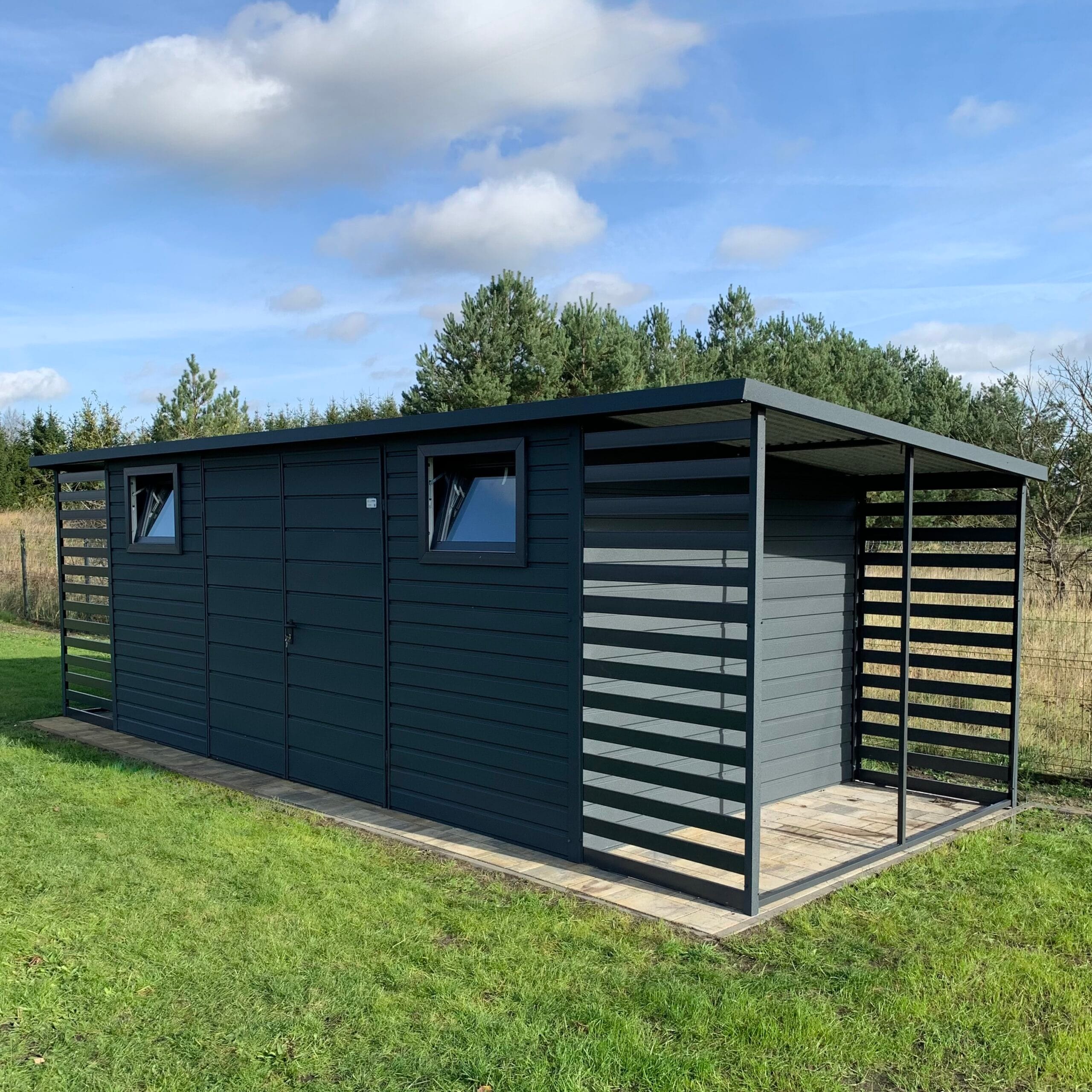 Domek ogrodowy narzędziowy wykonany z blachy trapezowej ocynkowanej w kolorze grafitowym o wymiarach 7x3,5 m z dwiema drewutniami. Dach konstrukcji jednospadowy pokryty blachą trapezową zapewni duże udogodnienie w przypadku większych opadów deszczu, czy śniegu. Domek ogrodowy dodatkowo został wyposażony w dwa okna PCV o wymiarach 80x60. Dzięki temu zapewniają doświetlenie wnętrza, a także poprawiają widoczność podczas pracy. Doskonale nadaje się do przechowywania narzędzi ogrodniczych takich jak kosiarka, taczka, meble ogrodowe, czy grill lub basen. Można go również wykorzystać jako schowek na opony samochodowe, czy rowery. Stalowa konstrukcja zabezpieczona antykorozyjnie zapewnia stabilność i bezproblemowe użytkowanie. Domek ogrodowy osłoni wszystkie zgromadzone w nim przedmioty przed nieprzyjaznymi warunkami atmosferycznymi zarówno w lecie, jak i w zimie. Zamykane dwuskrzydłowe drzwi wejściowe o wymiarach 200x200cm zabezpieczą przed niepożądanymi gośćmi. Wewnątrz pomieszczenia możemy ustawić regały według swoich upodobań i rozmiarów. Pozostałe miejsce możemy zagospodarować stołem warsztatowym dla majsterkowiczów. Zalety domku ogrodowego to przede wszystkim: