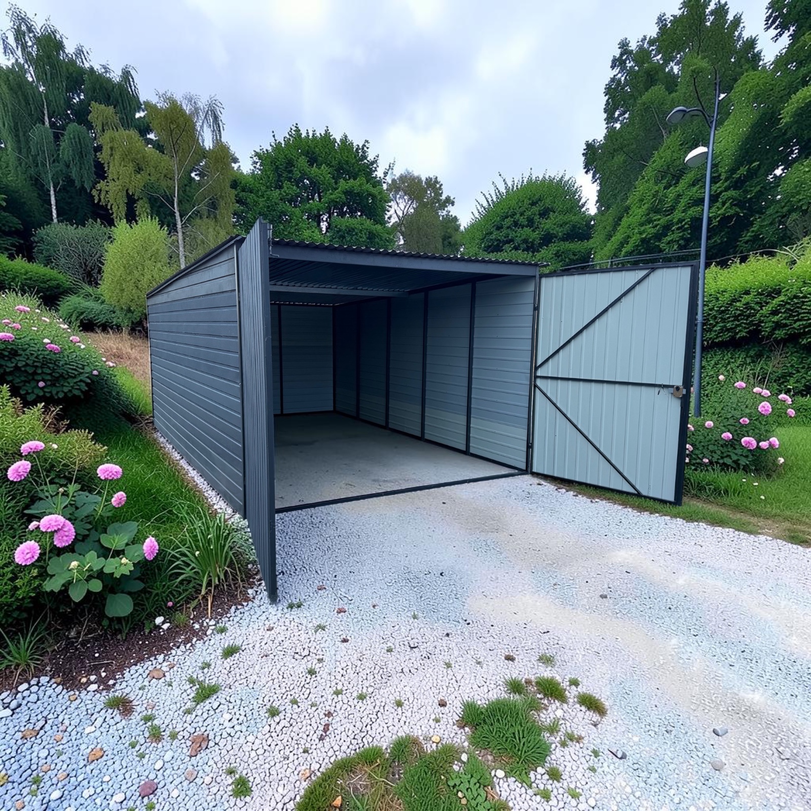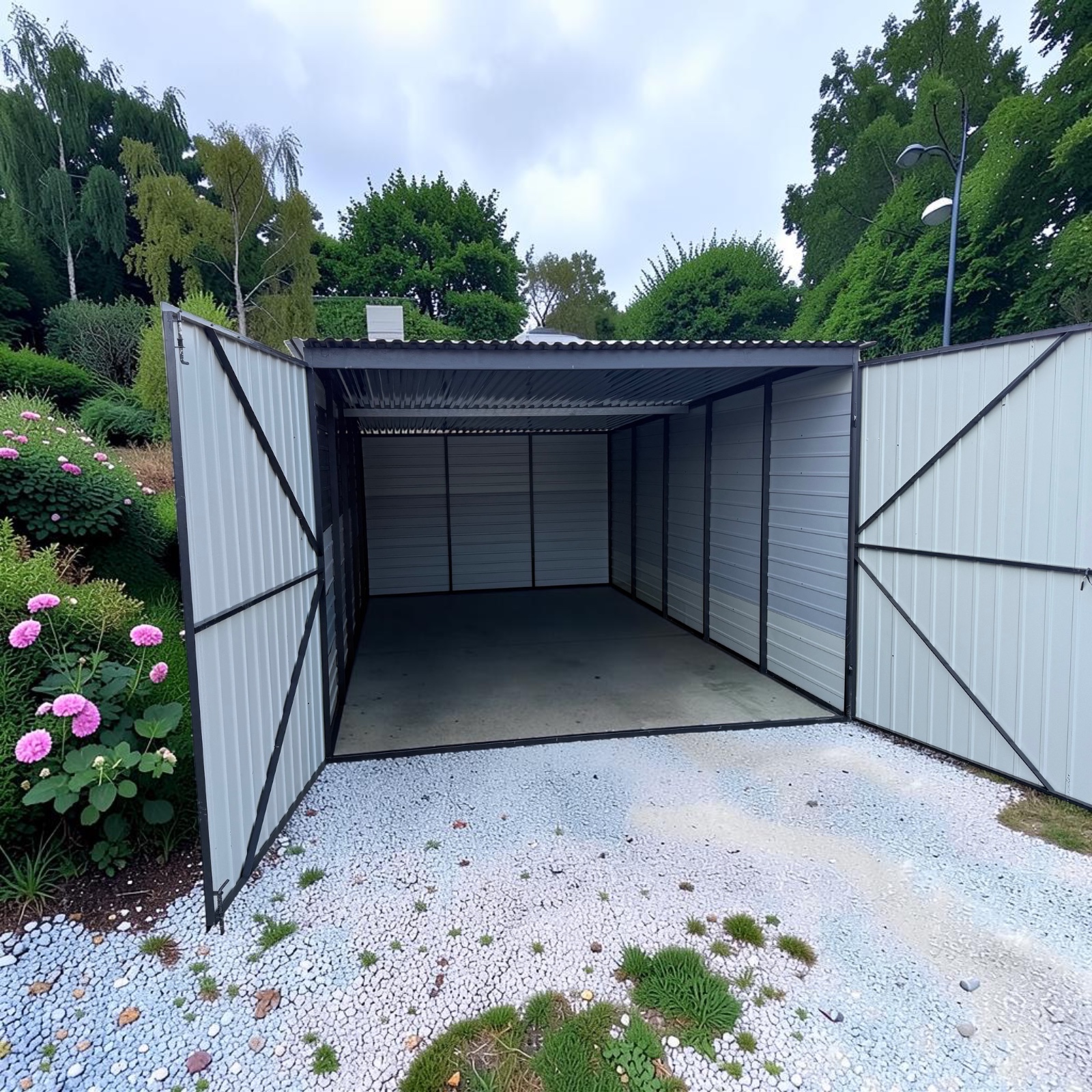 Garaż wyposażony jest w dwuskrzydłowe drzwi zamykane na klucz, co gwarantuje bezpieczeństwo przechowywanych przedmiotów. Ściany boczne zostały solidnie przymocowane do konstrukcji za pomocą nitów, co dodatkowo wzmacnia całość.