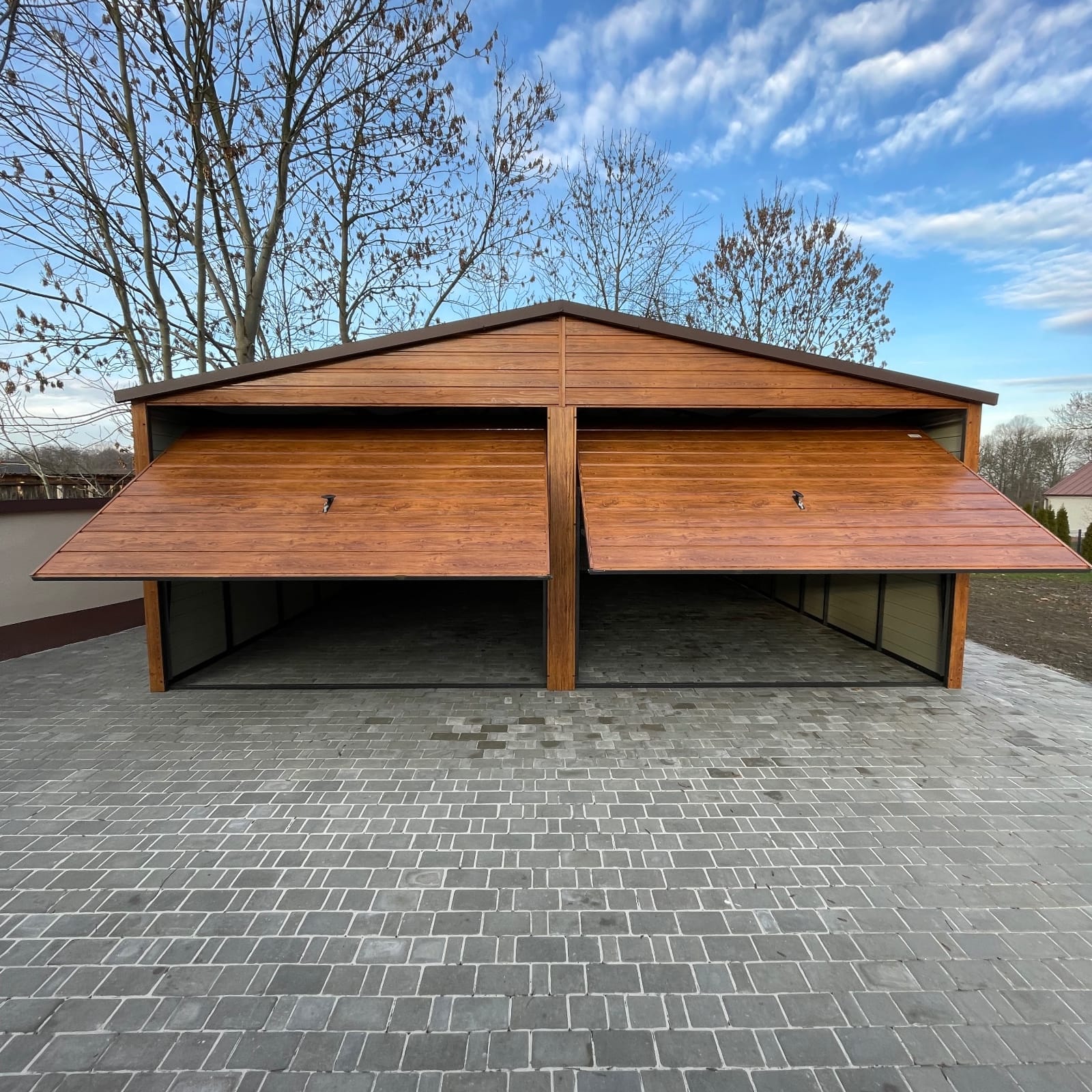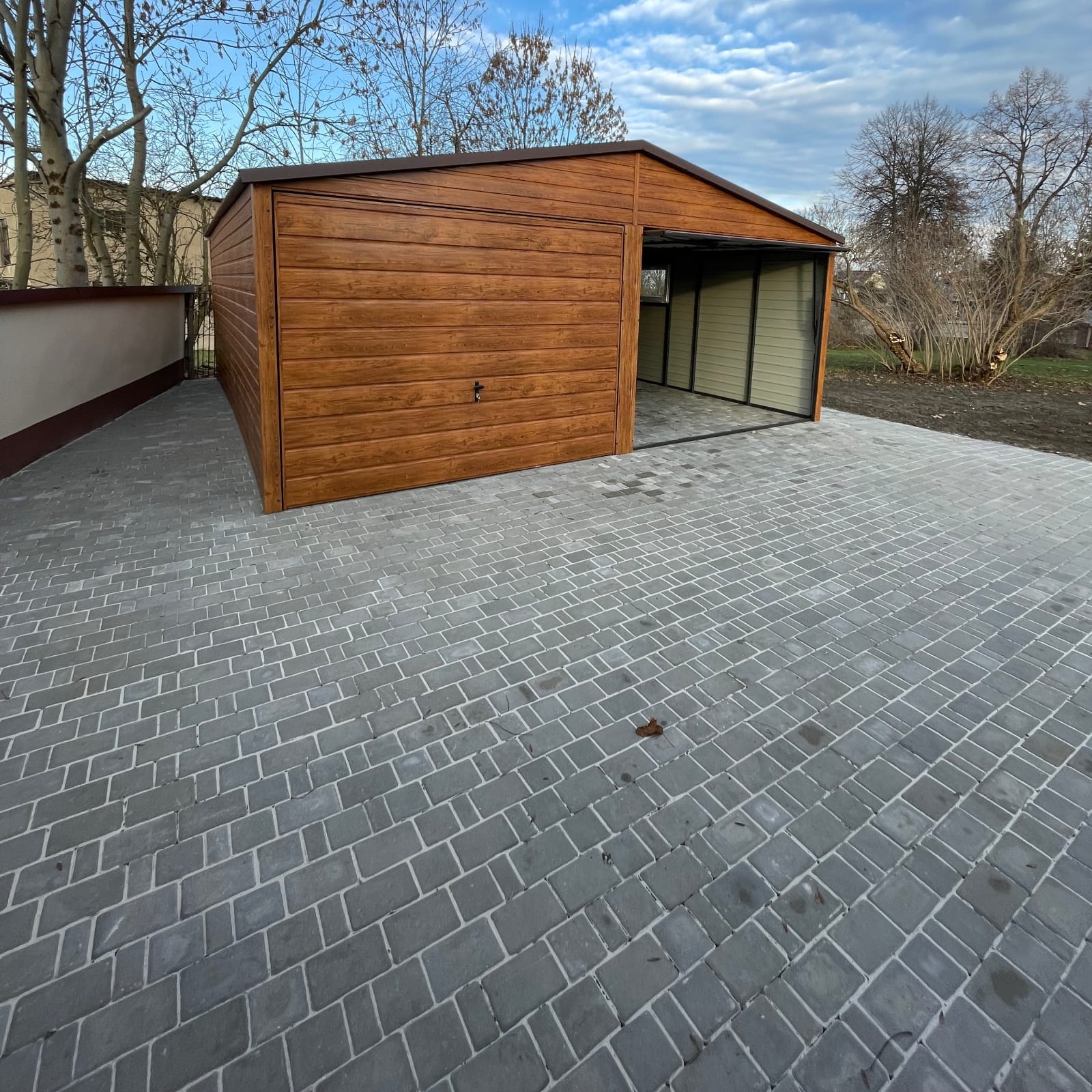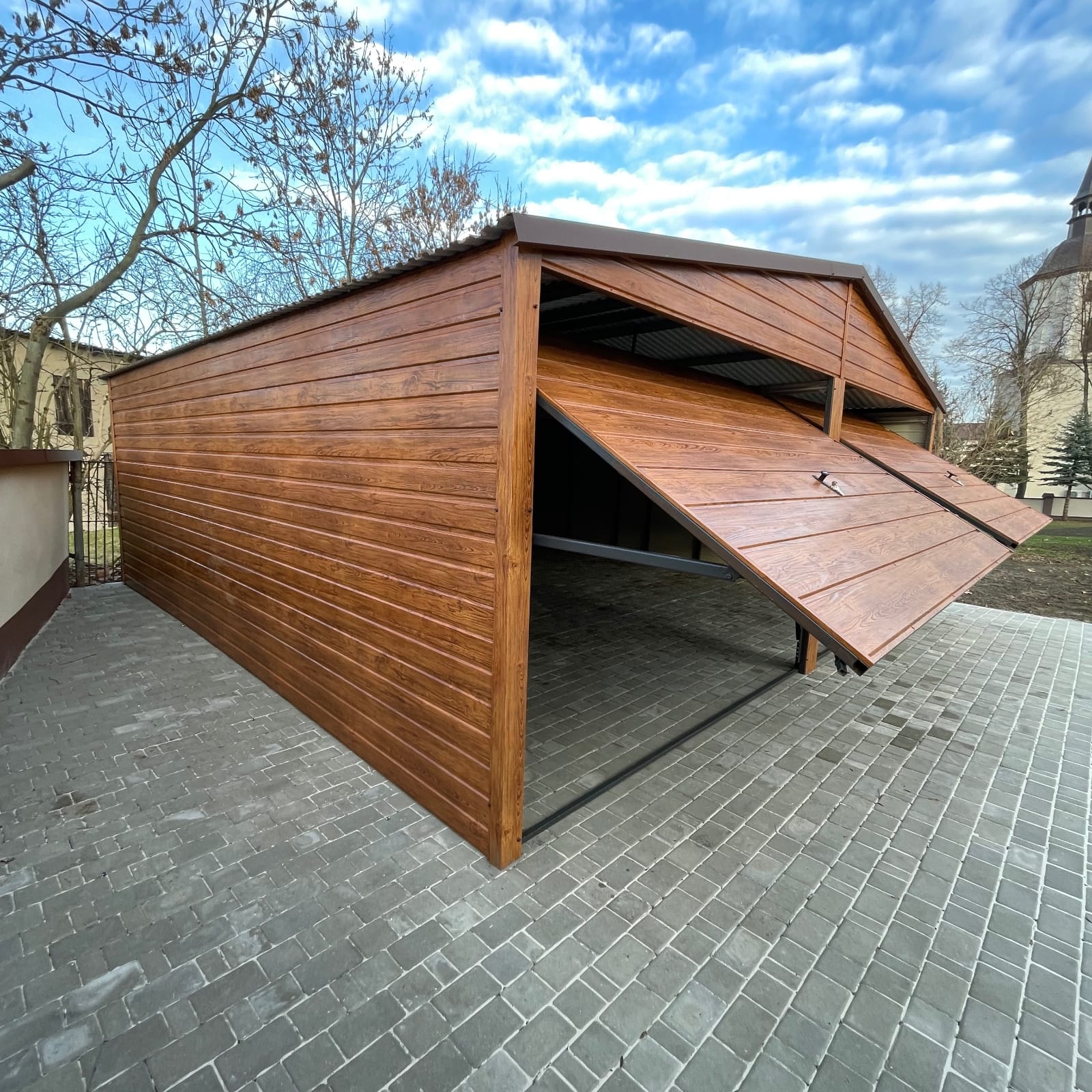Garaż otrzymał komplet obróbek blacharskich, które nie tylko poprawiają estetykę, ale również zwiększają ochronę konstrukcji przed czynnikami atmosferycznymi. Wykończenie drewnopodobne sprawia, że obiekt harmonijnie komponuje się z otoczeniem działki, a ponadto podnosi walory wizualne całej przestrzeni.