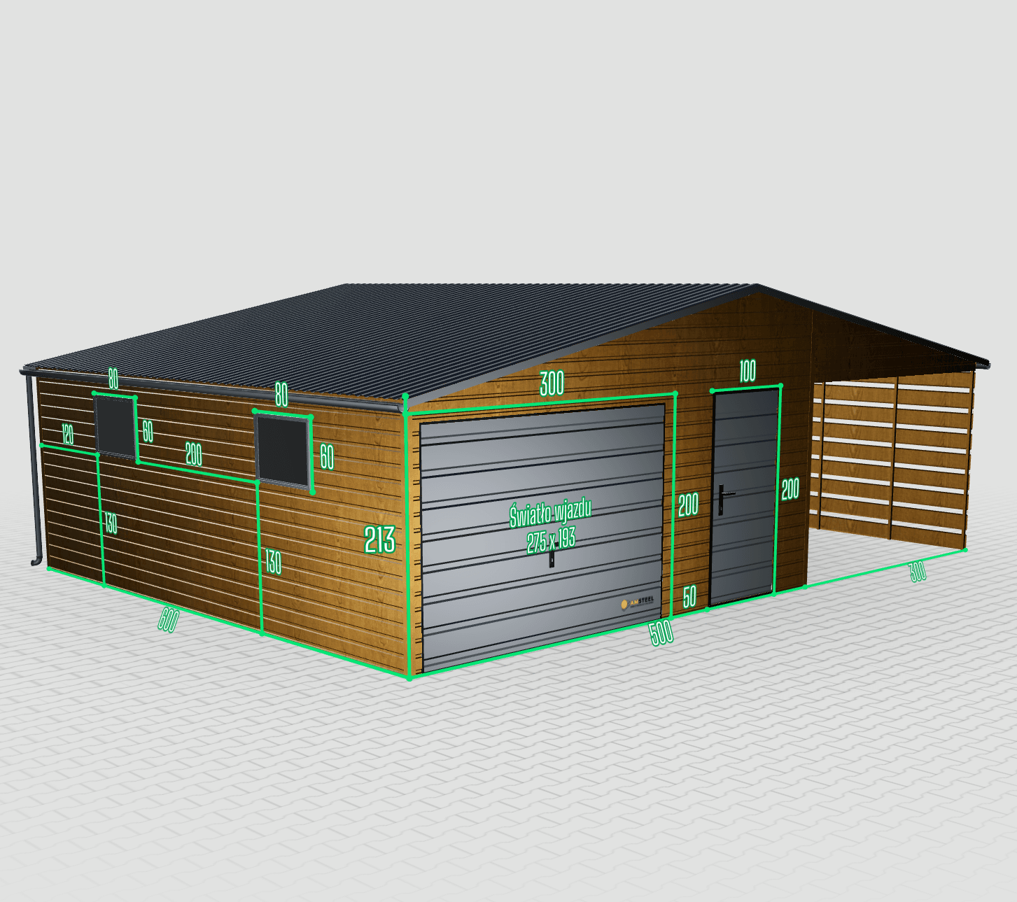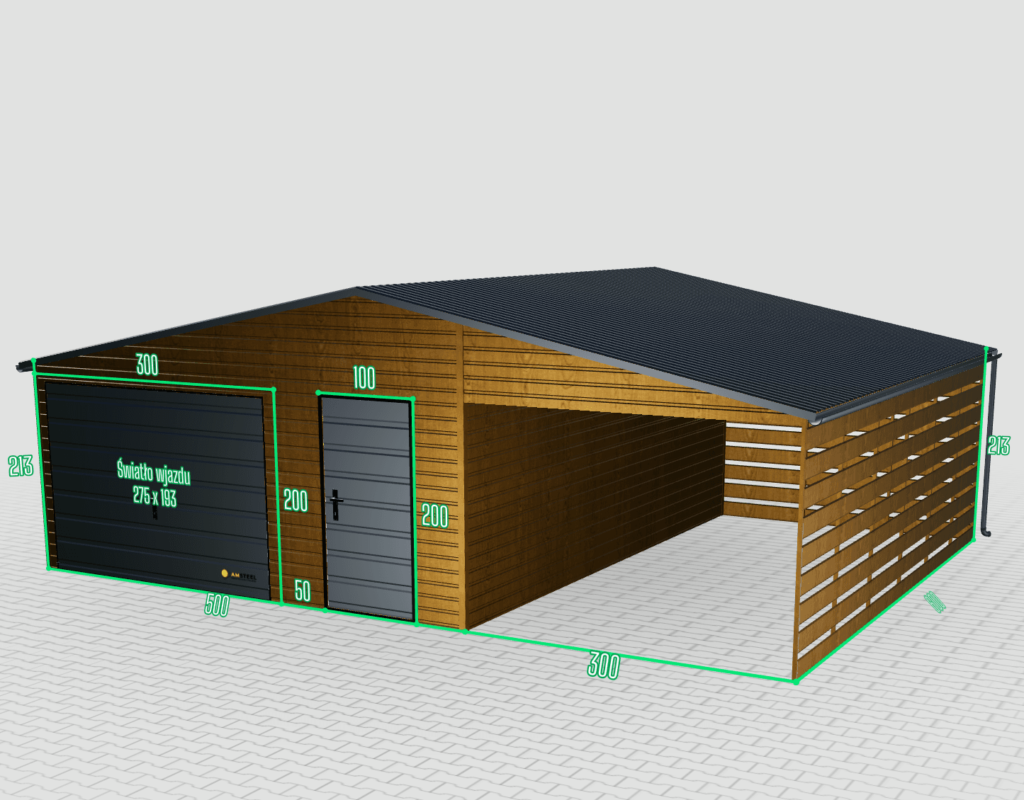 | Szerokość | 8m (garaż 5m + wiata 3m) |