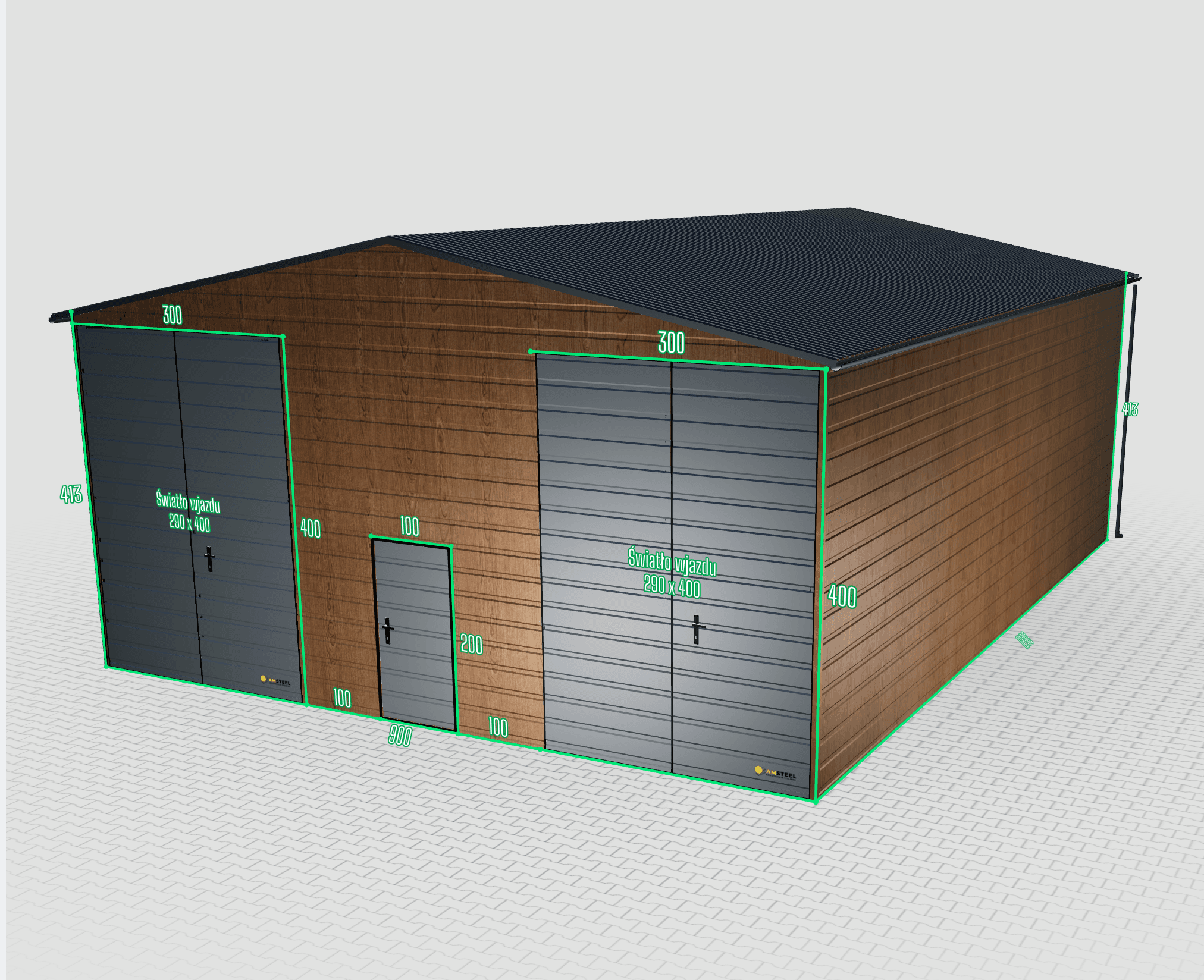Garaż ocieplany 9×12 z płyty warstwowej drewnopodobny dwie bramy dwuskrzydłowe 290×400