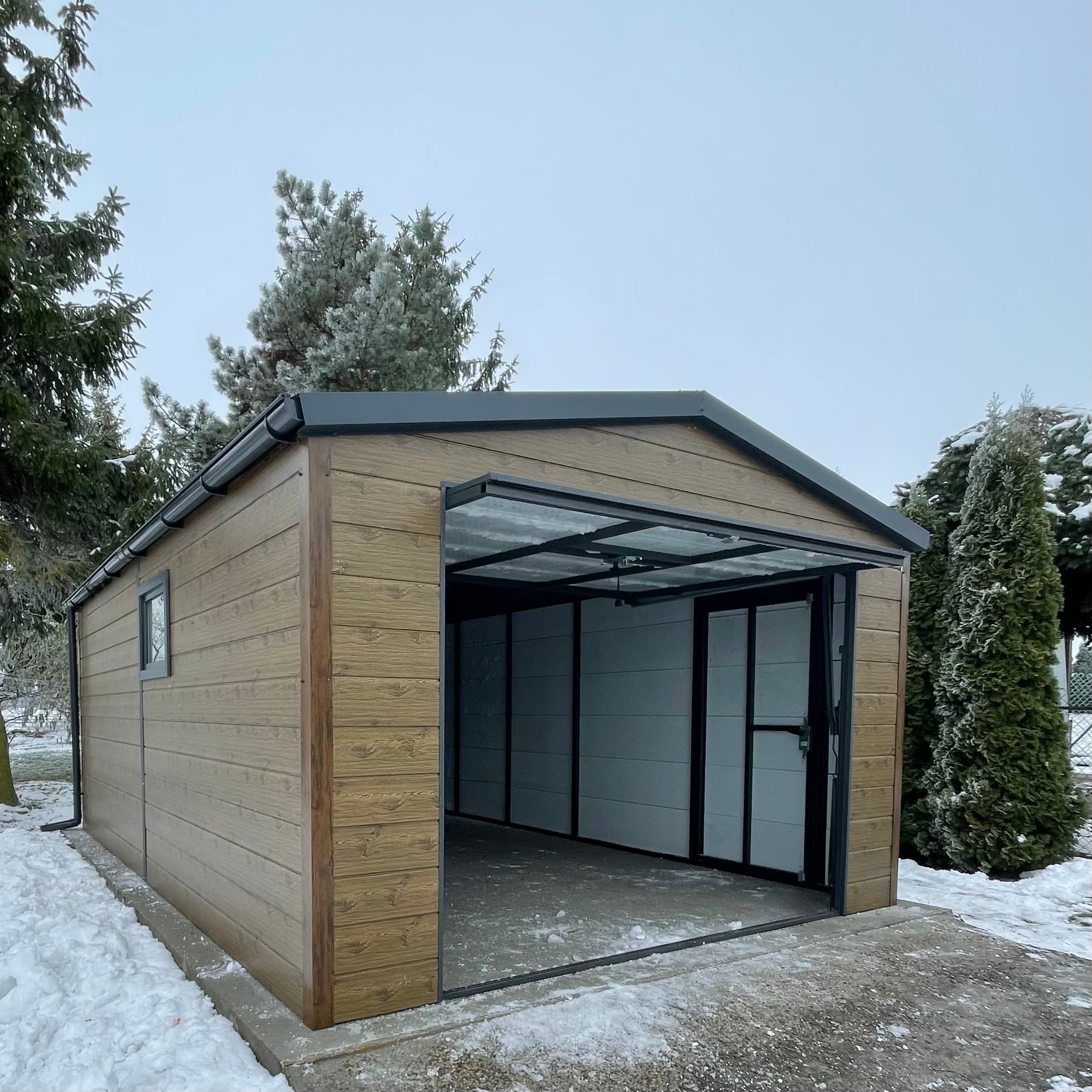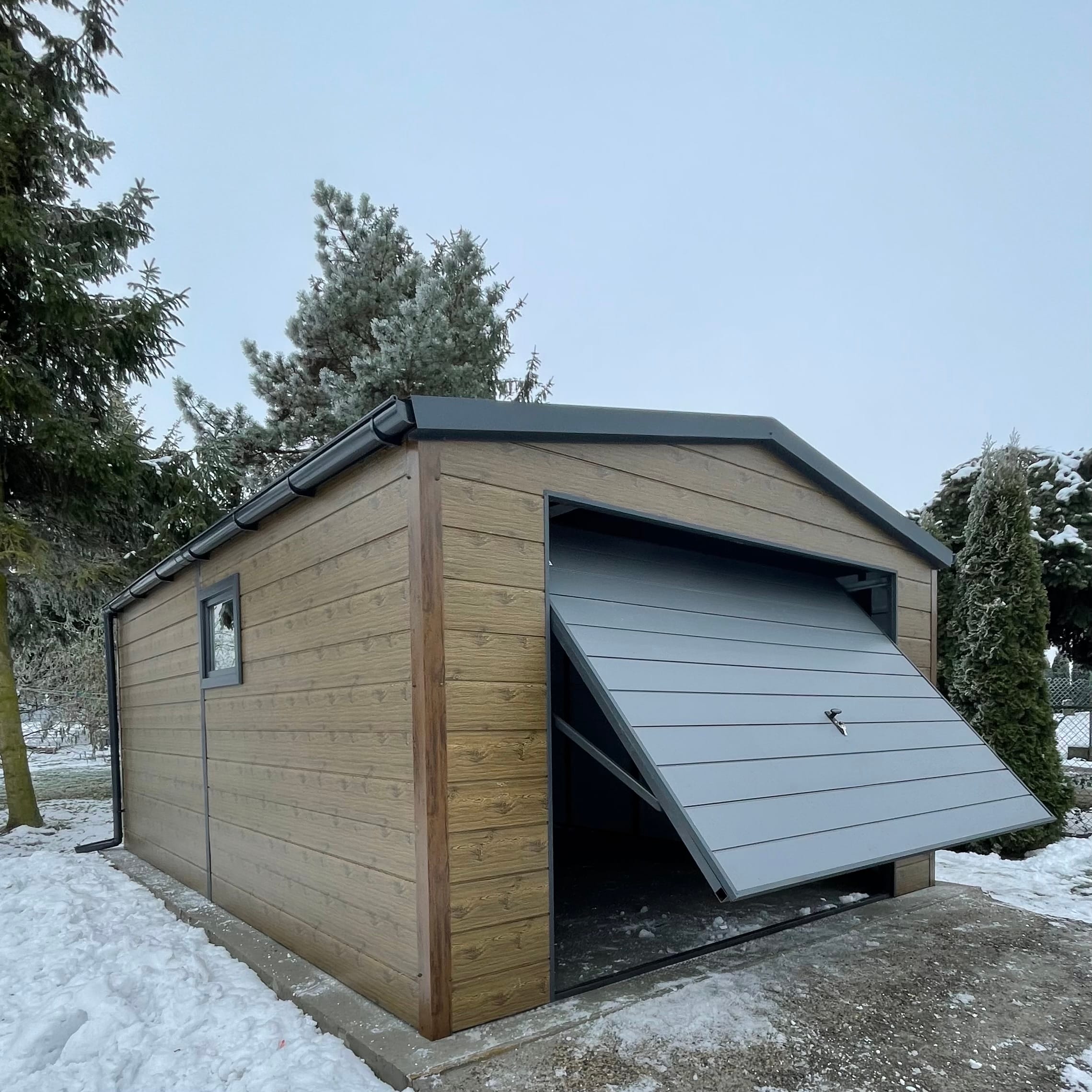 Garaż ocieplany z płyty warstwowej 4×8 drewnopodobny, brama uchylna