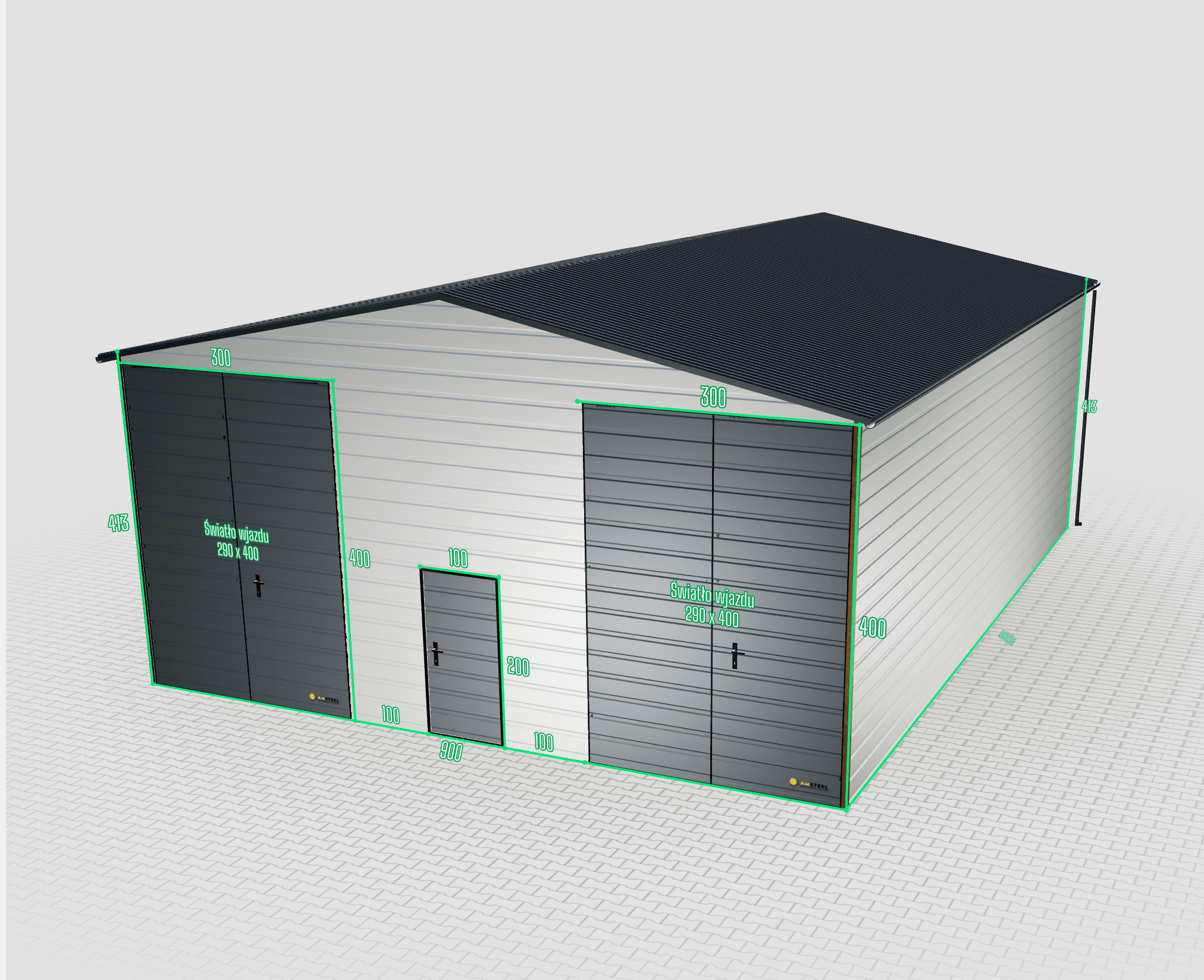 Drzwi dwuskrzydłowe o wymiarach 290x400 w kolorze grafitowym pozwalają na komfortowe otwieranie i zamykanie, dlatego staje się bardziej praktyczny. Na frontowej ścianie konstrukcji znajdują się drzwi o wymiarach 100x200, które znacząco poprawiają komfort użytkowania. Wnętrze o powierzchni 108 m² oferuje wystarczająco dużo miejsca nie tylko na samochód, ale też na regały z narzędziami, rowery czy opony sezonowe.