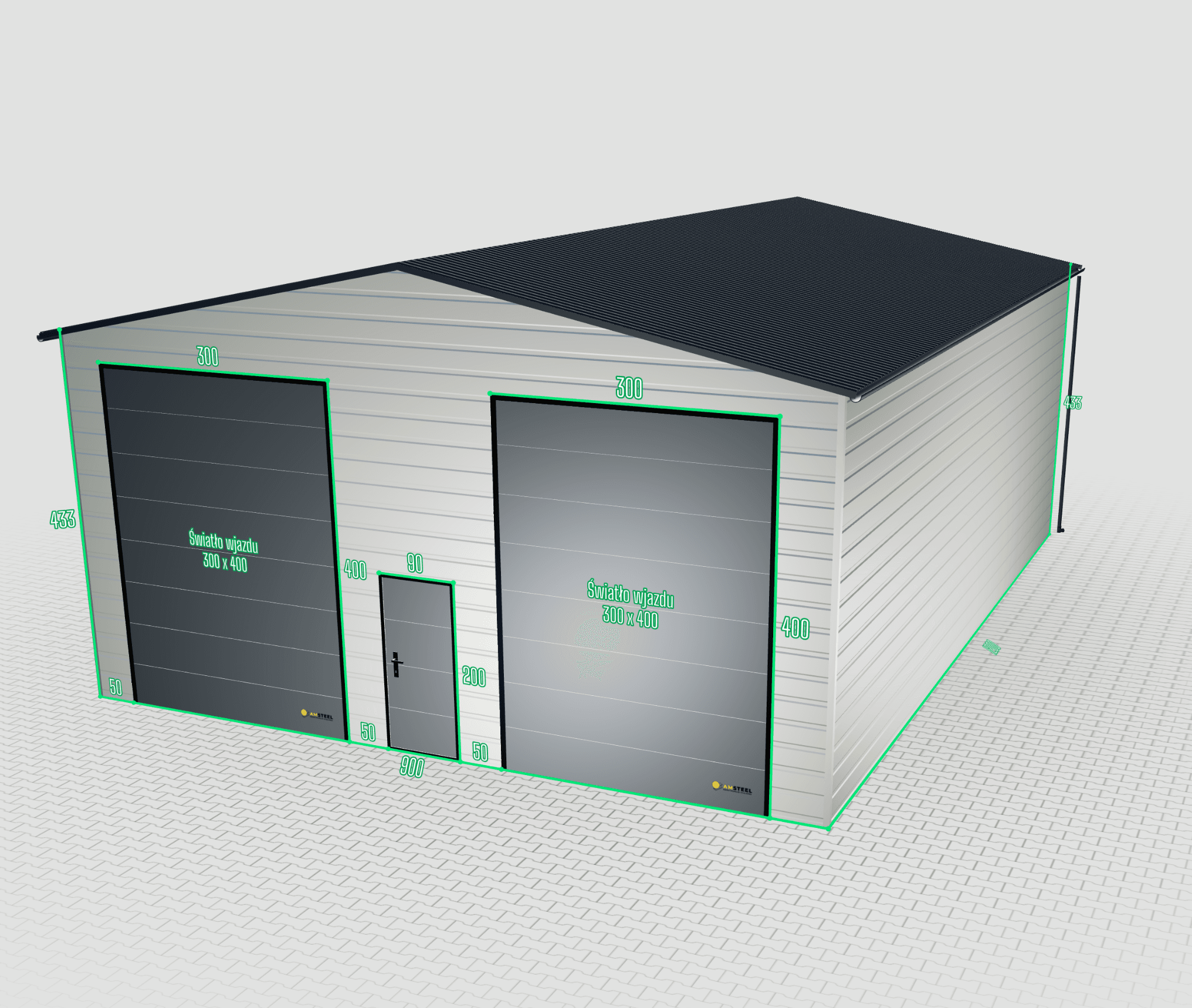 Garaż wykonany jest z płyty warstwowej w kolorze białym o grubości 2 cm, dzięki czemu łączy trwałość z eleganckim wyglądem. Do konstrukcji garażu używamy profil zamkniętych 40×40 zabezpieczonych farbą podkładową antykorozyjną co znacząco zwiększa odporność konstrukcji. Ściany tworzy płyta warstwowa poliuretanowej o grubości 2 cm, wypełniona pianką poliuretanową o przewodności cieplnej wynoszącej λ ≤ 0,022 . Płyty przykręcamy do konstrukcji w taki sposób, aby wkręty pozostały niewidoczne. Zewnętrzna strona płyty pokryta jest blachą aluminiową koloru białego, natomiast wewnętrzna pokryta jest blachą stalową koloru białego.